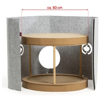 Der Aufbau mit zwei Etagen ist dabei aus leichtem und doch robustem Holz. Die anschmiegsame Filzumrandung der Katzenhöhle wird über das Holzgestell, kombiniert mit den Kratzflächen überstülpt und schafft somit einen stabilen und formfesten Aufbau des Katzenmöbels.