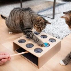 Die neue interaktive Spielbox mit extra großen Löchern ist ideal für Katzen aller Art. Die Spielbox ist aus stabilem, ungiftigen und umweltfreundlichen Holz gefertigt und bietet durch die qualitative Verarbeitung langen Spielspaß. Durch bewegen des mitgelieferten Spielstabs in der Box wird der Jagdinstinkt Ihres Stubentigers geweckt und gefördert. Die verschiedenen Einfräsungen der Löcher sorgen für ausreichend Abwechslung. Auf der einen Seite ist ein Pfotenmotiv eingefräst, auf der anderen wird es spannend mit neun eingefrästen Schlupflöchern. Der Spielstab ist mit einer Plüschmaus mit Federschwanz versehen und regt den Spieltrieb an.