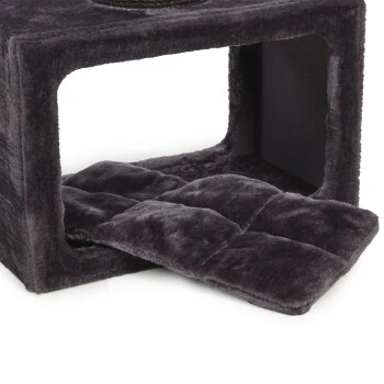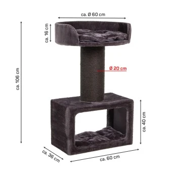 Bei einer Höhe von ca. 106 cm befindet sich das Kuschelbett auf einer angenehmen Position, um mit den Stubentigern sowohl im Sitzen als auch im Stehen zu interagieren. Der Kratzbaum kann praktisch auch neben dem Sofa platziert werden, sodass Ihr Liebling auf Augenhöhe mit Ihnen gemütlich verweilen kann. Auf der runden Liegefläche, welche ein Maß von ca. Ø 60 cm aufweist, befindet sich zudem ein komfortables Kissen. Der Kratzbaum eignet sich demnach prima zum Spielen, verstecken und auch zum kuscheln und schlafen.