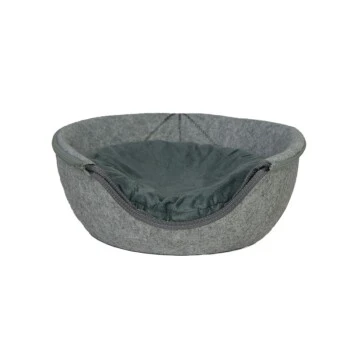 Diese Katzenhöhle aus wĂ€rmeregulierendem Filz ist eine gelungene Kombination von Körbchen und Höhle. Ober- und Unterteil sind durch einen ReiĂverschluss zu einer Kuschelhöhle vereint und können so aber auch einfach voneinander getrennt werden. Die Unterschale kann solo als Ruhekorb genutzt werden. Um das Liegen noch bequemer zu gestalten, liegt dem Lieferumfang ein weiches Kissen (Ă ca. 37 cm) bei. Es enthĂ€lt eine VliesfĂŒllung. Der Bezug ist nicht abnehmbar und durch HandwĂ€sche zu reinigen. Drei schöne ZiernĂ€hte auf der Oberseite, durchbrechen die schlichte Form.